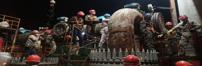第一天氯乙烯裝置迅速拉開檢修戰(zhàn),先是對(duì)水堿洗組合塔進(jìn)、出管口線漏點(diǎn)進(jìn)行消除,安排吊車及相關(guān)人員在場(chǎng),辦證,拆除管節(jié)前的準(zhǔn)備工作做好后立即組織人員開始卸閥門,在檢修工和吊車的完美配合下,漏點(diǎn)的管節(jié)拆除完成,后安排生產(chǎn)科主管去平羅襯塑。另外一邊精餾場(chǎng)地也是熱鬧非凡,檢修工作雖然忙碌但不盲目,人員拆除,你卸閥門,他焊缺口,我高空作業(yè),吊車協(xié)助拆卸高低塔塔盤篩網(wǎng),安全著陸后立即組織人員進(jìn)行清洗,清洗完成后又組織安裝,一切如行云流水,維修工熟悉的手法給安全檢修及順利開車又加了一道保險(xiǎn);旌厦撍芫技改是片區(qū)及集團(tuán)公司領(lǐng)導(dǎo)關(guān)注的重點(diǎn),此次檢修,管線碰口,也是尤為重要,在相關(guān)技術(shù)人員及維修工的協(xié)作下,做了氣相預(yù)留口,為后期混合脫水項(xiàng)目開車平穩(wěn)運(yùn)行埋下了伏筆。