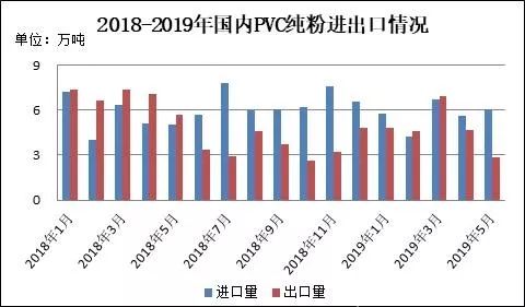 圖5 2018-2019年國內(nèi)PVC純粉進出口情況