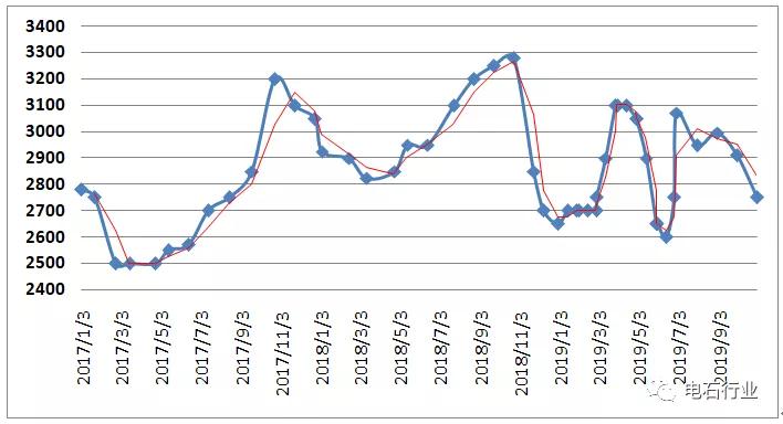 2019年電石市場波動不同于2018年,價格出現(xiàn)了連續(xù)快速的波動,漲跌幾乎無任何喘息時間,主要受到供需持續(xù)波動的影響。前半年經(jīng)歷大幅漲跌,上漲時連續(xù)大漲,漲幅超過600元/噸,下跌時快速下移,降幅跌破成本線后再度下行400元/噸,回吐了全部漲幅;三季度電石價格呈現(xiàn)“N”字型走勢,先漲后跌再漲,變化幅度略小于上半年:7月價格前漲后穩(wěn)月底局部小幅下調(diào),多數(shù)時間慣性上漲200-300元/噸,隨后月底局部價格下調(diào)50元/噸左右;8月份價格下行200-300元/噸,回吐前期漲幅;9月份價格再度反彈,至月底已反彈了150-250元/噸不等;10月電石價格再次極速下滑300元/噸,1-10月電石價格呈現(xiàn)“M”字型,回落到當前主流價格的2550-2650元/噸。